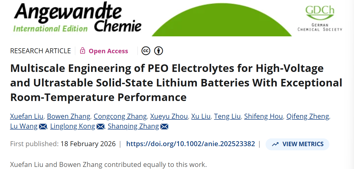 2On February 18, 2026, Associate Professor Wang Lu and her coworkers from our institute published their latest research findings online in the internationally renowned journal Angewandte Chemie International Edition (Q1, Impact Factor: 16.9). The paper, titled "Multiscale Engineering of PEO Electrolytes for High-Voltage and Ultrastable Solid-State Lithium Batteries With Exceptional Room-Temperature Performance," represents a significant breakthrough. Graduate student Liu Xuefan and Professor Zhang Bowen are the co-first authors. Corresponding authors include Associate Professor Wang Lu, Associate Professor Kong Linglong from the College of Forestry, and Professor Zhang Shanqing from Guangdong University of Technology. Shandong Agricultural University is the primary affiliation for this paper.。