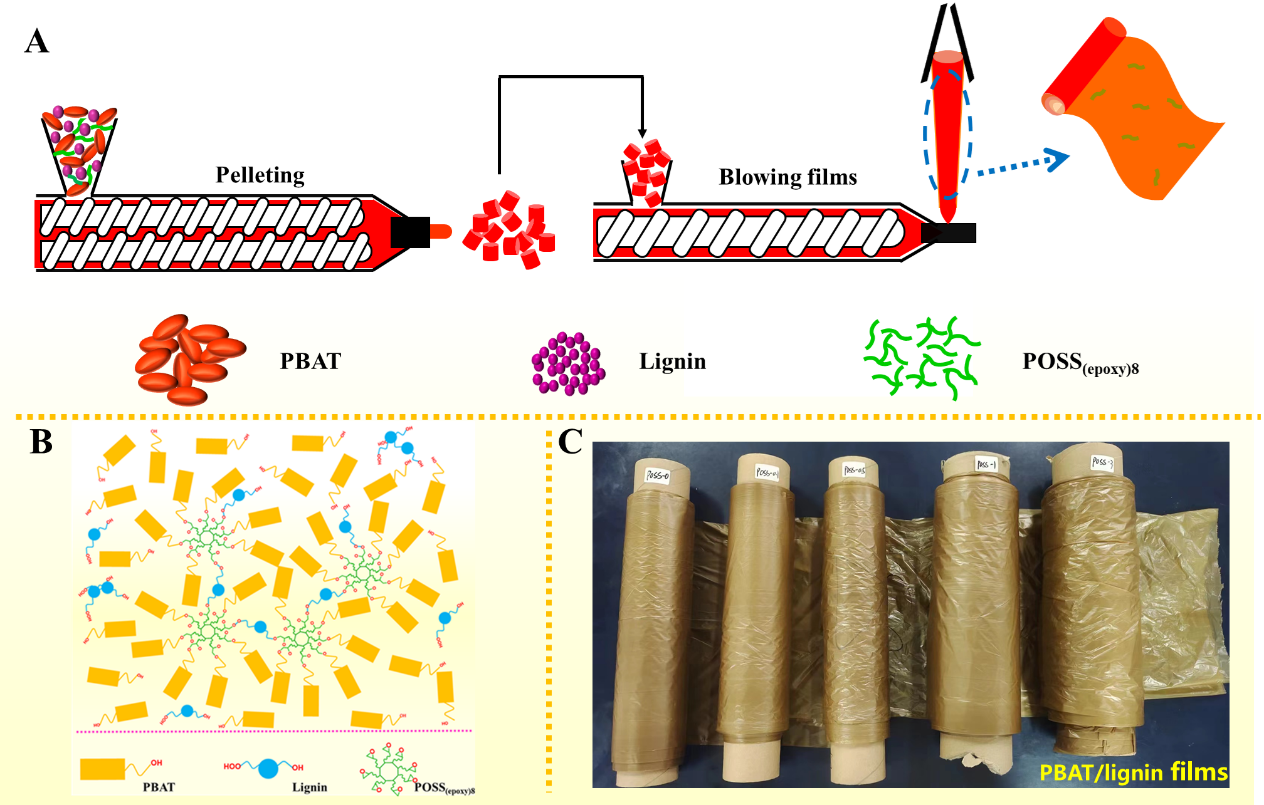 Based on this, Professor Xu Jing and Associate Professor Xie Jiazhuo from Green Materials and Green Energy Research Group of Shandong Agricultural University used POSS(epoxy)8, a caged polysesquioxane rich in epoxy groups, as compatibilizers to adjust the processing process. POSS(epoxy)8 epoxy groups reacted with the terminal hydroxyl groups of PBAT, carboxyl groups and lignin hydroxyl groups, which also achieved reactivity hyperplasia during processing. The thermal properties, mechanical properties, water resistance and UV aging resistance of PBAT/ Lignin films were improved. This work provides a new idea for developing low cost and high performance PBAT-based films.